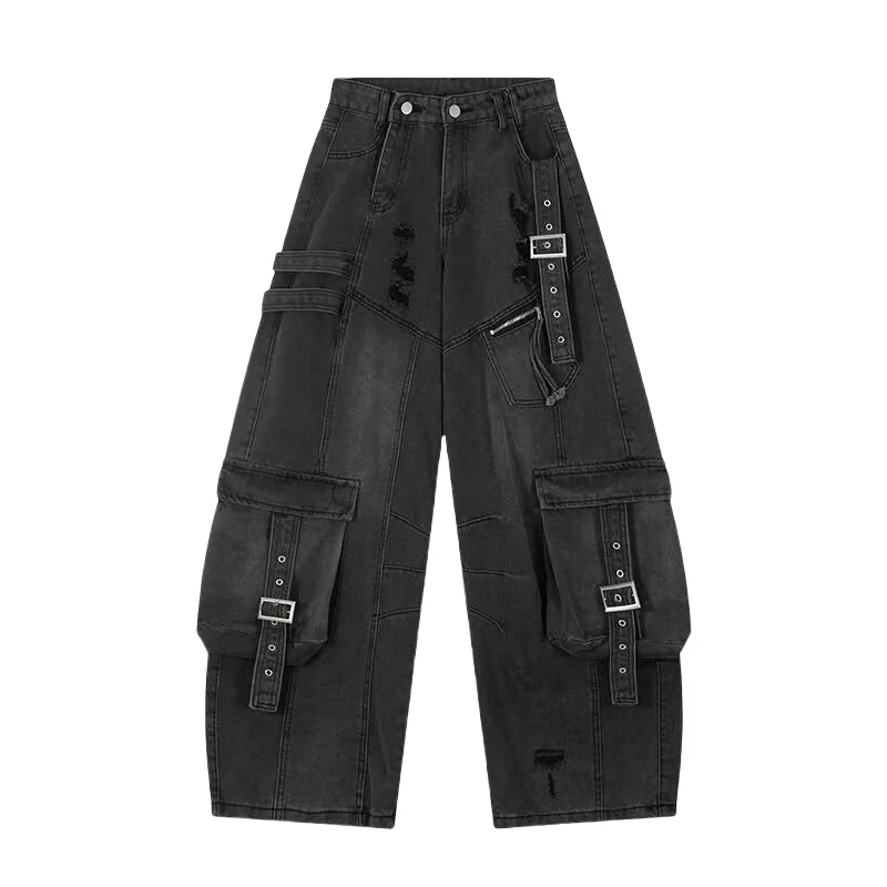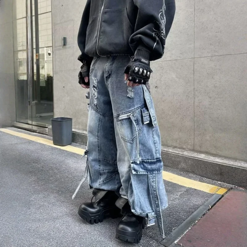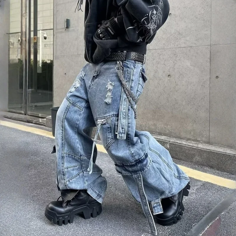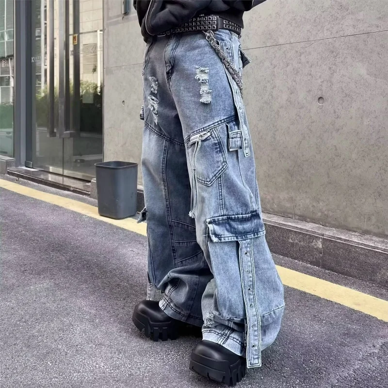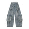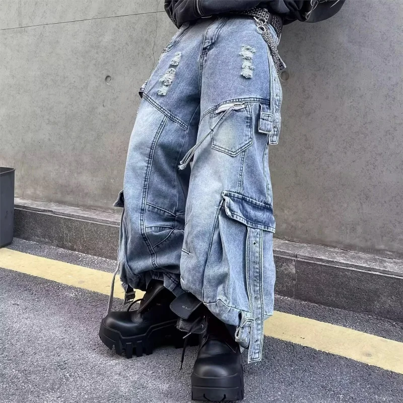 Washed Blue Distressed Wide Leg Cargo Jeans